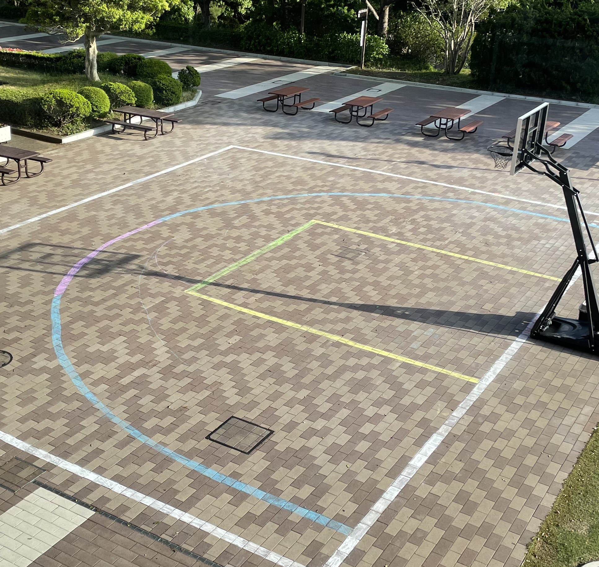 RKU BASKETBALL LAB“バスラボ”(スポーツコミュニケーション学科・小谷ゼミ)に所属する2年生が、3・4年生の協力を仰ぎ、バスケットコートを作成。コートのラインは、多様性への取り組みを示すレインボーカラーとし、“レインボーコート”と名付けました。