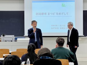 本郷谷健次市長からは、松戸市の歴史に始まり、市が現在注力している基本政策の内容に至るまで、豊富な資料をもとにお話がありました。特に、松戸市の子育て支援政策が毎年、全国トップレベルの評価を得てきたことには、多くの学生が驚かされたようです。