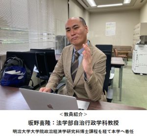 みなさん、こんにちは!今回で第3回目となりました「法学部で広がる未来の自分の可能性」では、流通経済大学の法学部について多くの方に知っていただくため、法学部の先生方にインタビューを行っています。今回は、自治行政学科の坂野先生に「自治行政学科」という流通経済大学法学部ならではの学科についてお話ししてもらいました。自治行政学科の学びの内容やその魅力、また卒業生の進路についてもお尋ねしましたので、ぜひ坂野先生のお話をお聞きいただければと思います!