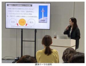 最終日の28日午後に会場内の特別コーナーステージで国際文化ツーリズム学科准教授の須川まり先生が30分間の講演を行いました。この講演は、「映画にみるランドマーク表象 ―観光都市京都を事例に―」と題し、京都を舞台に撮影された映画の中で京都タワーをはじめとするさまざまな京都のランドマークがどのように扱われているかを分析するものでした。