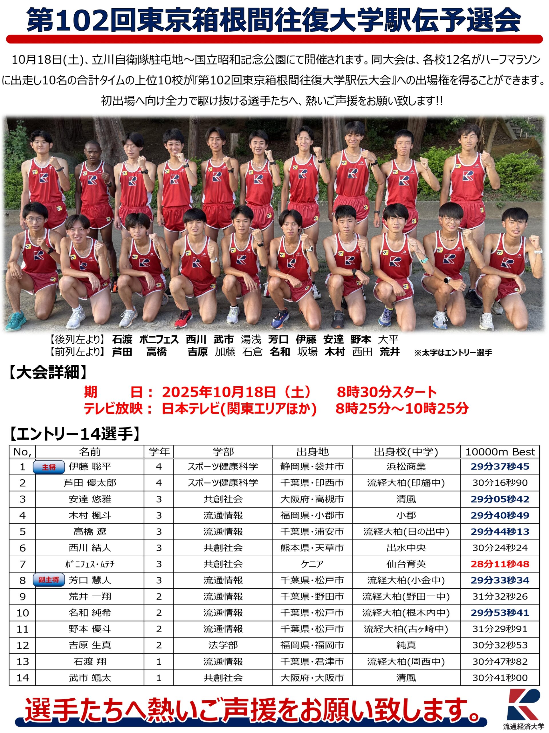 流通経済大学陸上競技部の駅伝チームが、今週末10月18日(土)に東京都立川市で開催される、第102回東京箱根間往復大学駅伝競走(箱根駅伝)の予選会に出場します。今年の予選会には、42校がエントリー。陸上自衛隊立川駐屯地から国営昭和記念公園までのハーフマラソン(21.0975km)に各校12人が出走し、上位10人の合計タイムで10校の本選出場権を競います。