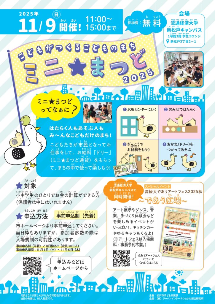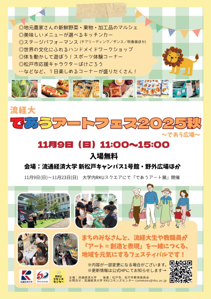 活動の集大成は、11月9日(土)に本学で開催される「流経大であうアートフェス2025秋 ~であう広場~」で、体験型アトラクションとして「ミニ★まつど」~こどもがつくるこどものまち~が開かれます。