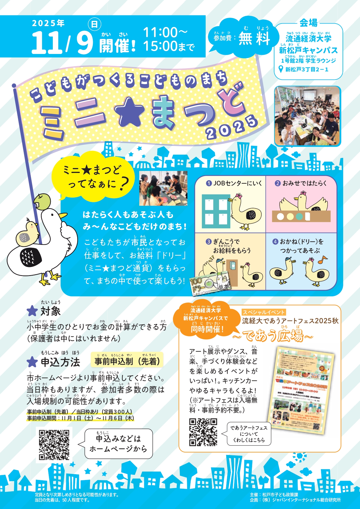 流経大生と地域の子どもたちがともに創り出す「こどものまち」に、みなさんぜひお越しください。