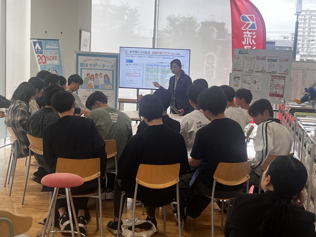今回は、両キャンパスの就職キャリア支援センターにて少人数形式で行われ(スポーツ健康科学部は学部単位で開催)、参加した学生からは積極的な質問が次々と飛び出し、就職活動への関心の高さがうかがえました。