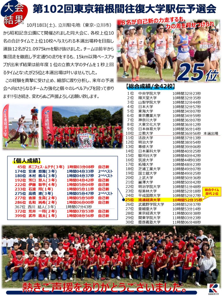 流通経済大学陸上競技部の駅伝チーム(駅伝部)は、10月18日(土)、第102回東京箱根間往復大学駅伝競走(“箱根駅伝”)の予選会に出場しました。