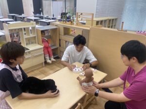 学生たちは、実際の保育現場を思い浮かべながら、保育者役と子ども役に分かれて活動を体験。子どもの興味を引き出す工夫や、遊びを発展させる方法を学びました。