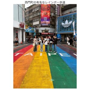 2つ目に,10月25日に開催されたTaiwan LBGT+ Prideに参加しました。台湾はアジアで初めて同性婚を法制化しました。日本でも毎年様々な都市でプライドパレードが開催されていますが(例えばTokyo Pride),台湾でのパレードは規模が非常に大きいです。パレード当日に西門町(台湾の渋谷・原宿)に行ってみたところ,午前中にも関わらず既に多くの人で賑わっていて,レインボー歩道のところでコスチュームを着たり記念撮影をしたりと,現地人・観光客ともに楽しんでいる様子でした。このレインボー歩道は,DEIを受け入れる台湾社会の象徴的な風景の一つです。