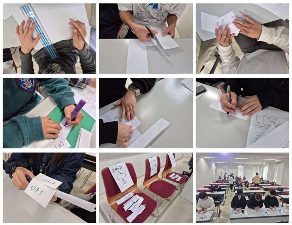 産業組織心理学(担当:中村美枝子)では、ワークを行いながら講義を進めています。今回は、飛行機を製造するラインのゲームをしました。