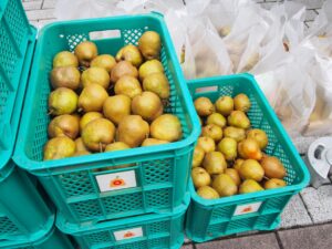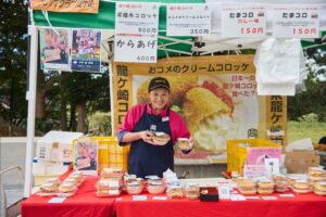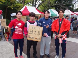 また龍ケ崎市内から、お馴染みの「龍ケ崎コロッケ」や、今回初めて「王騎ラーメン」に出店いただき、さらに本学OBが経営する山形県「王将果樹園」の絶品ラ・フランスも登場しました。