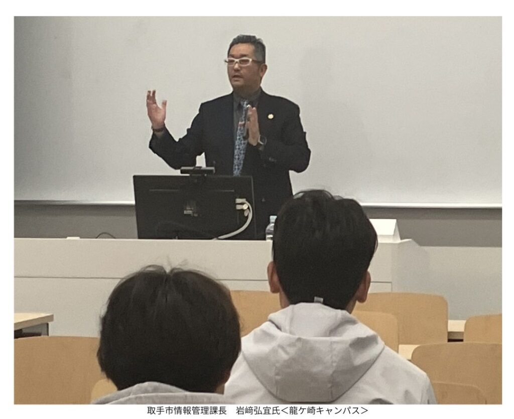 「地方自治概論」は自治行政学科1年の必履修科目です。地方自治の現場で活躍するゲストをお招きした授業を展開しています。今回は取手市役所情報管理課の岩﨑弘宜(ひろまさ)課長が両キャンパスにお越し下さいました。