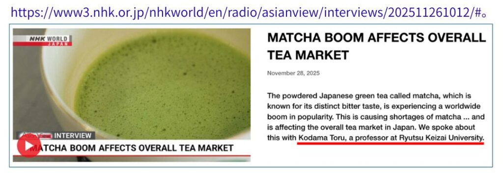 流通情報学部の児玉徹教授が出演した英語インタビュー番組「MATCHA BOOM AFFECTS OVERALL TEA MARKET」がNHKの国際ラジオ放送「Asian View」のウェブサイト上で公開中です!