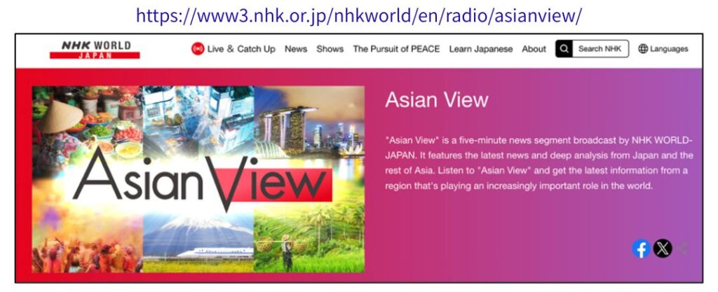さらにNHKの「Asian View」のラジオ番組は、以下のNHK World Japanのウェブサイト上で一定期間公開されることで、世界中の人々によって聴かれます。本学の学生のみなさんの英語学習用にも、ぜひご活用ください!