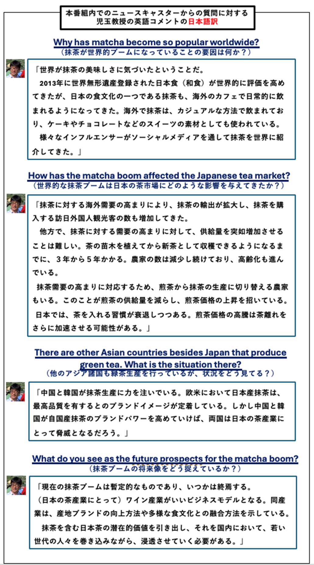 「海外での抹茶ブームが日本の茶市場に対して与える影響」について扱った同番組の中で、児玉教授は、NHKキャスターのYoshi Ogasawaraさんからの様々な質問に対して、英語でコメントを述べています。その内容の日本語訳については、以下を参照してください。