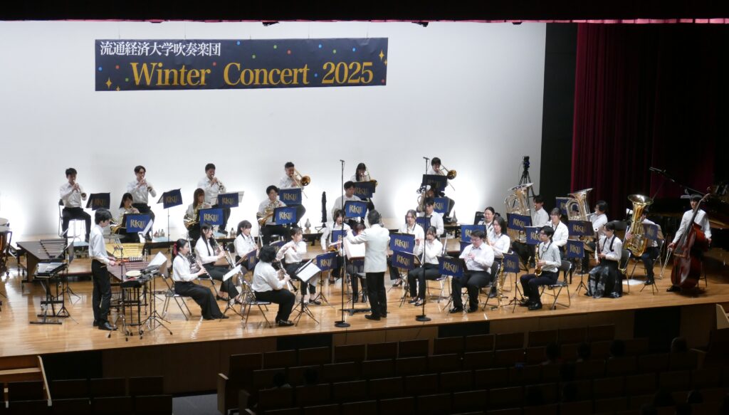 年末恒例の流通経済大学吹奏楽団『流吹』によるウィンターコンサートが、11月30日(日)に新松戸キャンパスで開催されました。当日は穏やかな天候にも恵まれ、小さいお子さんから年配の方まで250人を超える地域の方々にご来場いただき、会場は終始和やかで温かい空気に包まれました。