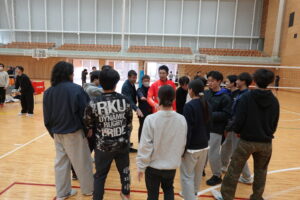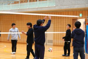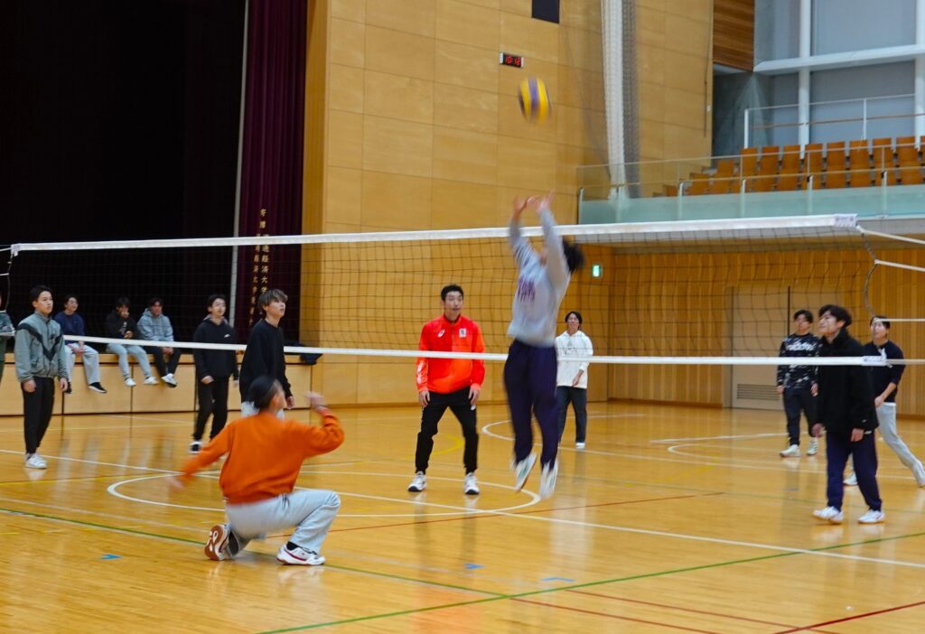 続いて行われた体験会では、参加した学生が耳栓を着用し、日本代表選手と一緒に「デフバレーボール」を実践しました。声や音に頼らず、視線やジェスチャーを使ってコミュニケーションを取りながらプレーすることで、音のない環境でプレーすることの難しさ・相手を意識することの大切さを実感する時間となりました。