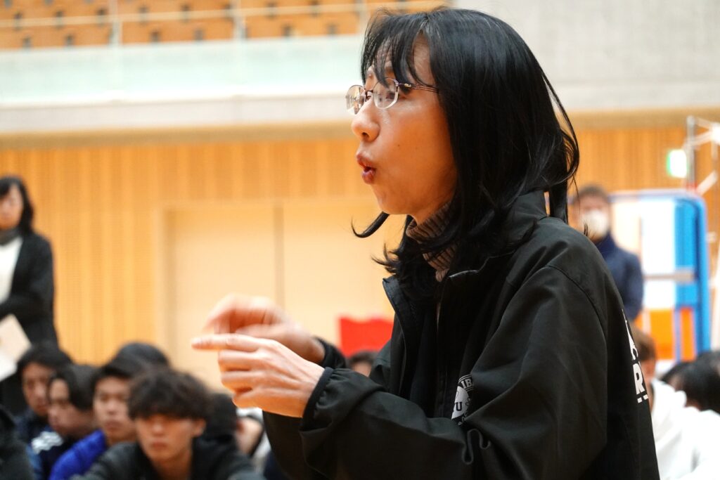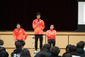 「集団生活において大切なのは相手を思いやる気持ち」と学生に伝えるキャプテンの高橋選手