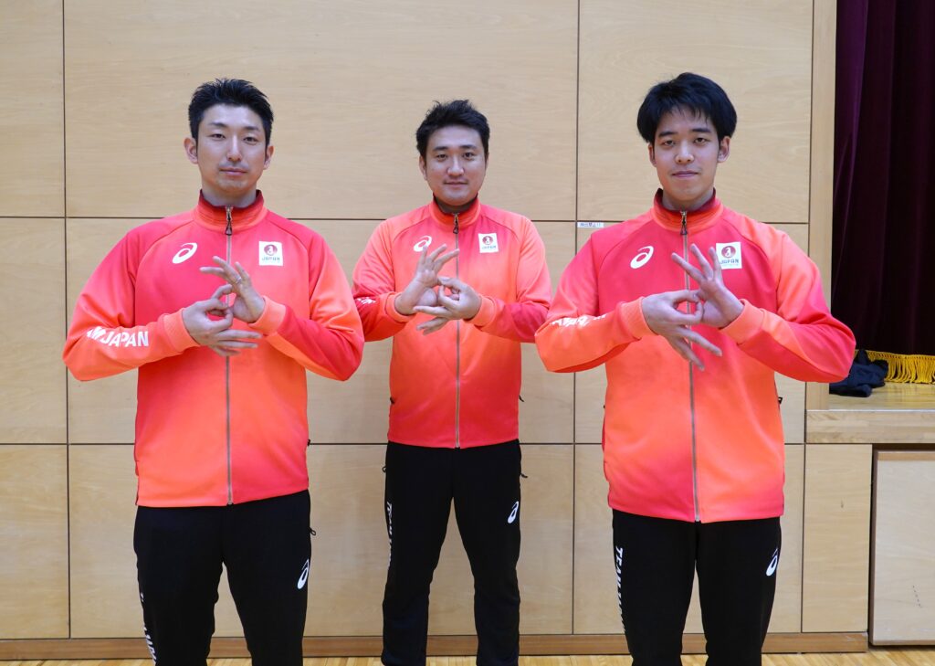 左から、東京2025デフリンピックバレーボール男子日本代表の高橋 竜一選手、大坪 周平選手、村井監督