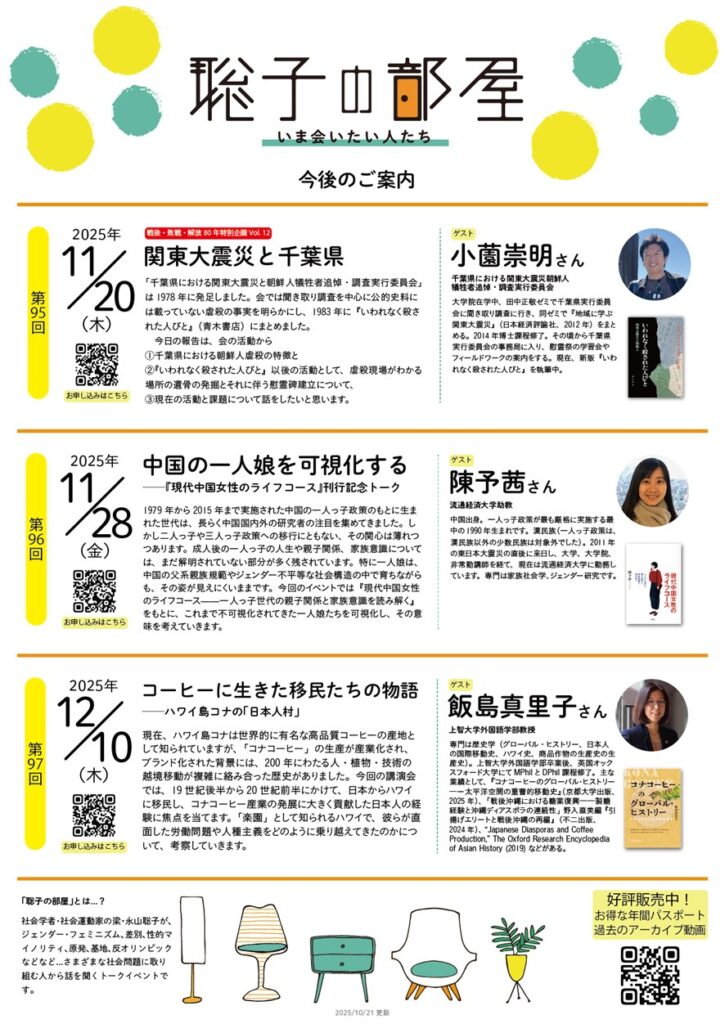 11月28日(金)、共創社会学部・地域人間科学科の陳予茜助教が、社会学者の梁・永山聡子氏が主宰するトークイベント「聡子の部屋」の第96回に登壇しました。