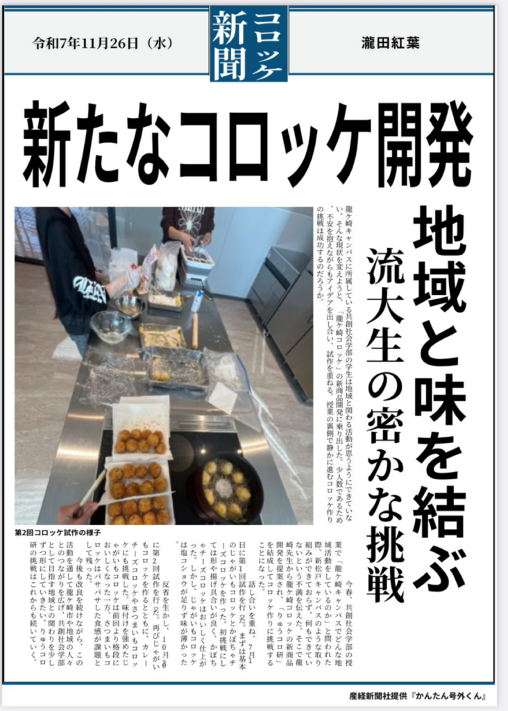 私たちは龍ケ崎市の施設「Rink」のキッチンスタジオを利用しコロッケ作りを行ったことを基に新聞を書きました。