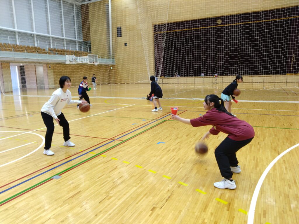 はじめは緊張していた中学生たちでしたが、本学女子バスケットボール部の小澤季節キャプテン(スポーツ健康科学部3年)と大窪耀平監督の指導の下、基本動作や遊びを取り入れた練習で一緒に汗を流していくうちに、かけ声や笑顔がたくさん出るようになりました。