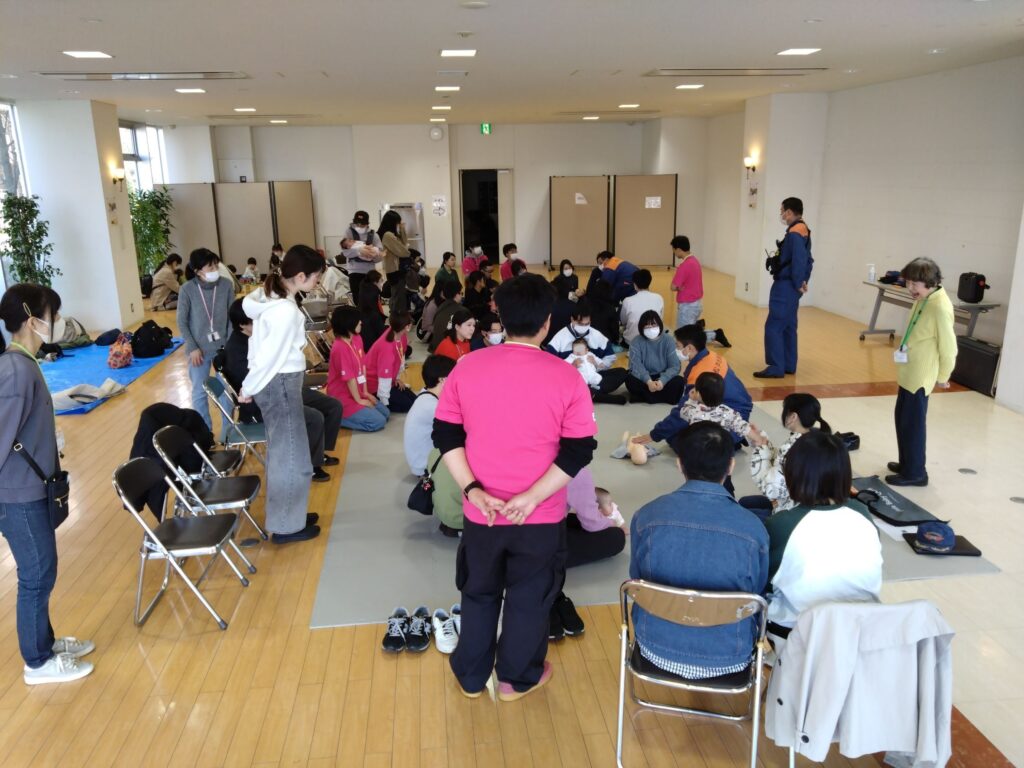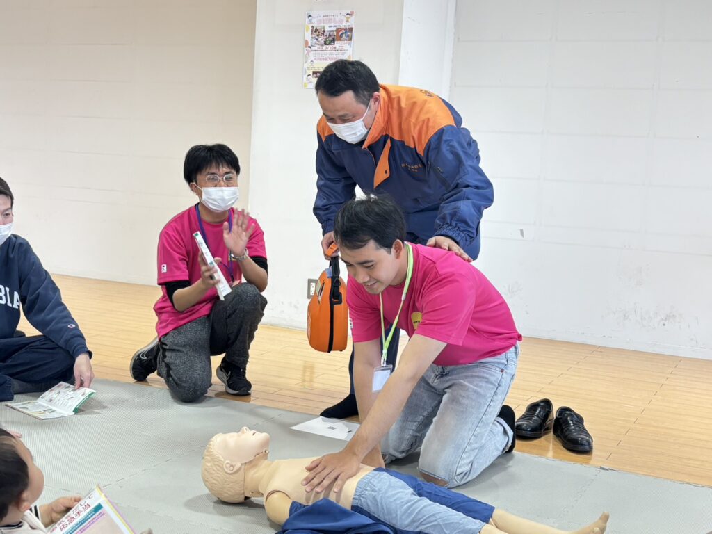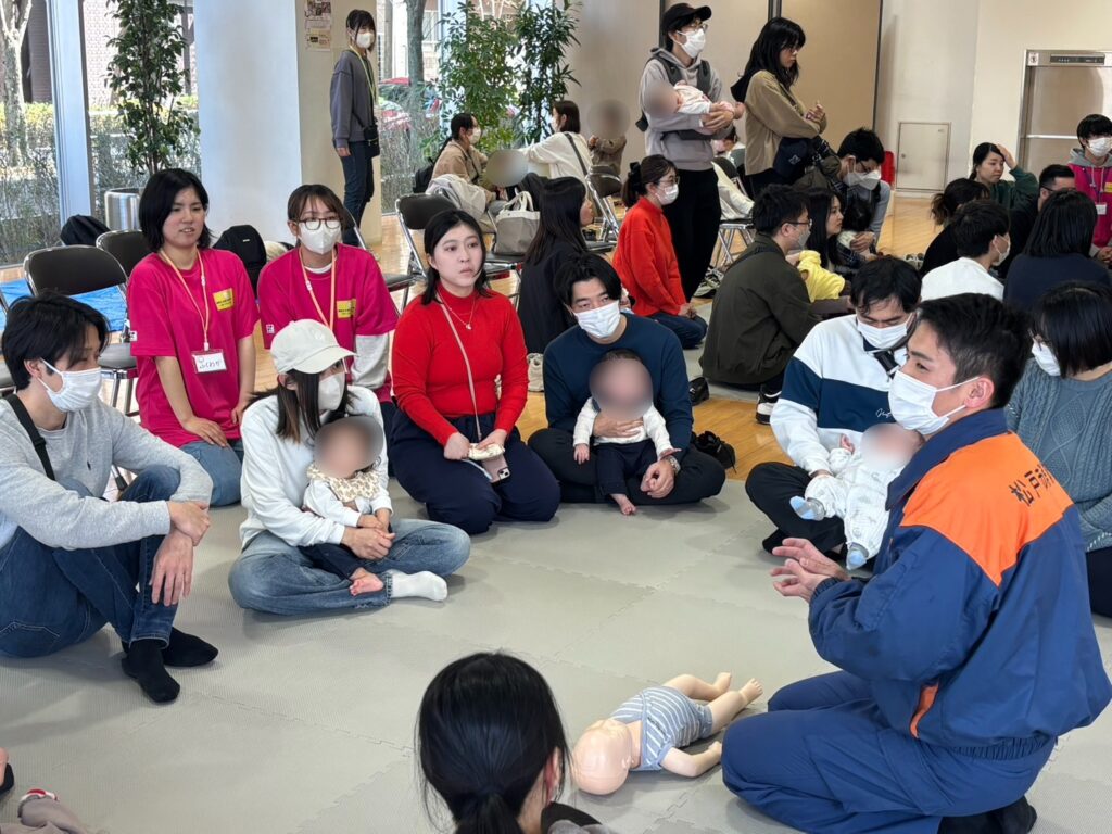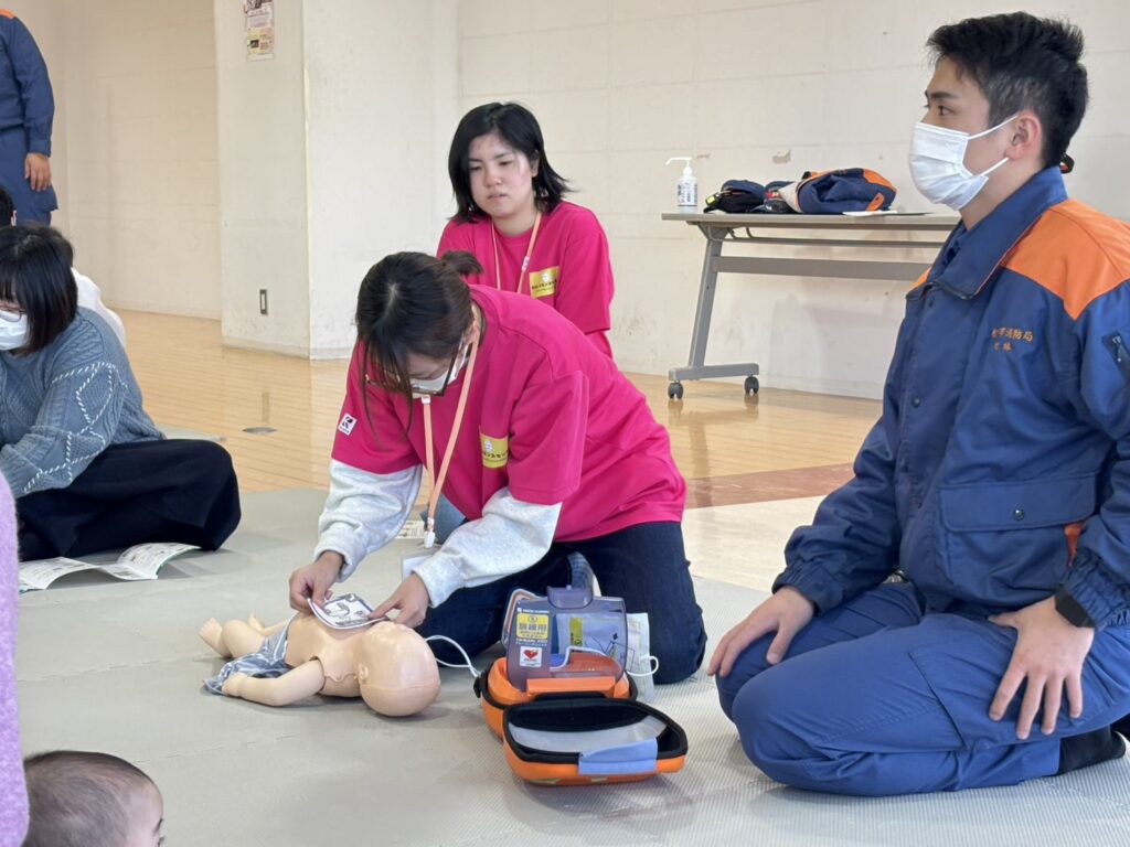 学生たちは来場した20組の親子(59人)と一緒に、心肺蘇生、AED体験、誤飲・怪我など緊急時の対処法を馬橋消防署の隊員たちから直接レクチャーを受けたり、子どもたちと遊んだりしました。
