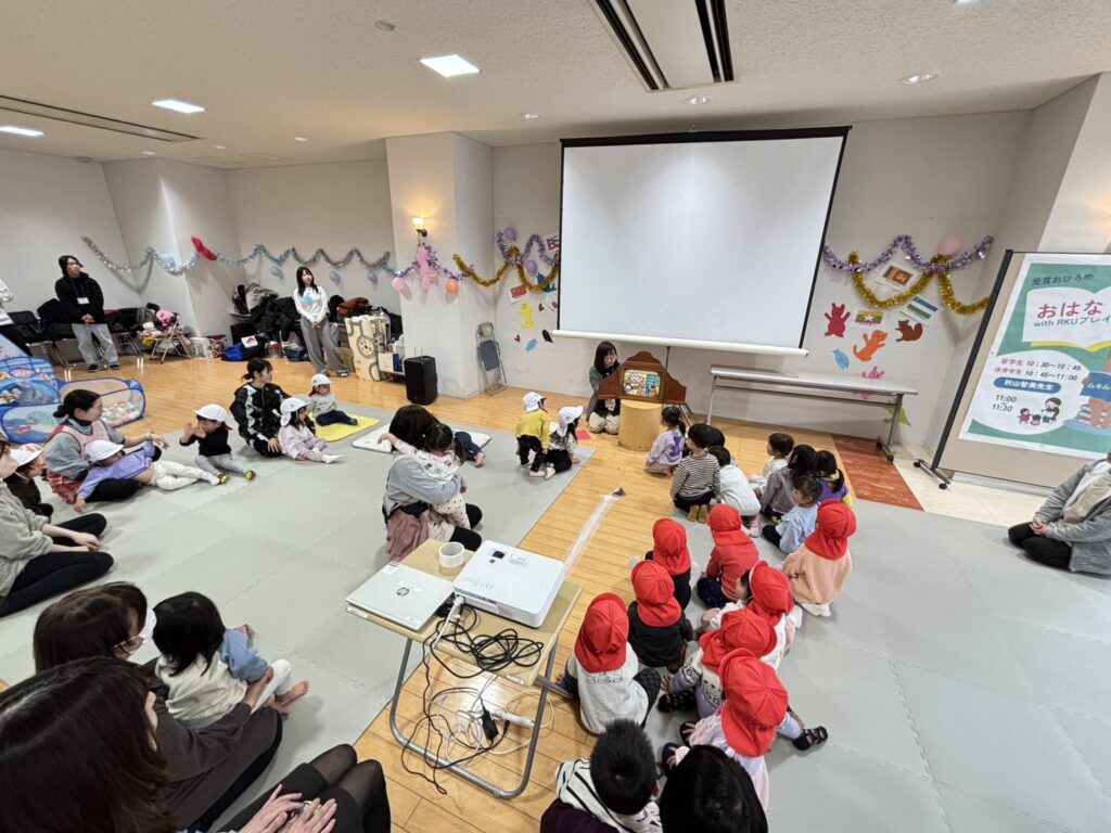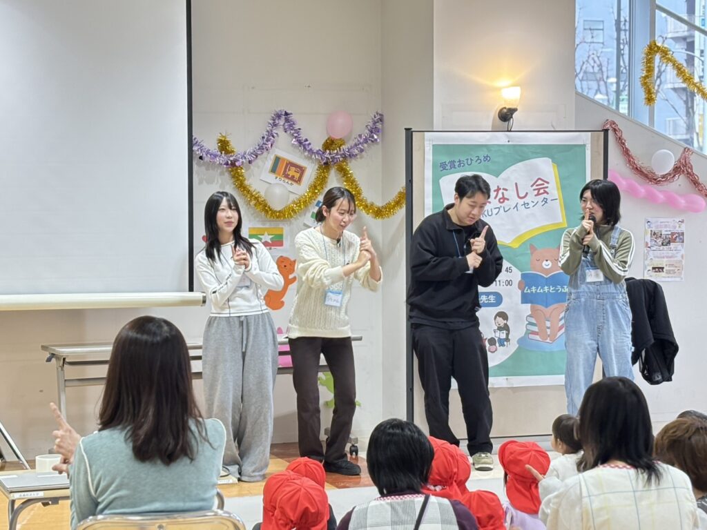 “おはなし会withプレイセンター”は、本学で保育を学ぶ学生・留学生が中心となって準備や運営などを行い、キャンパス周辺の保育園や児童預かり施設などから約60人の子どもたちがやってきました。