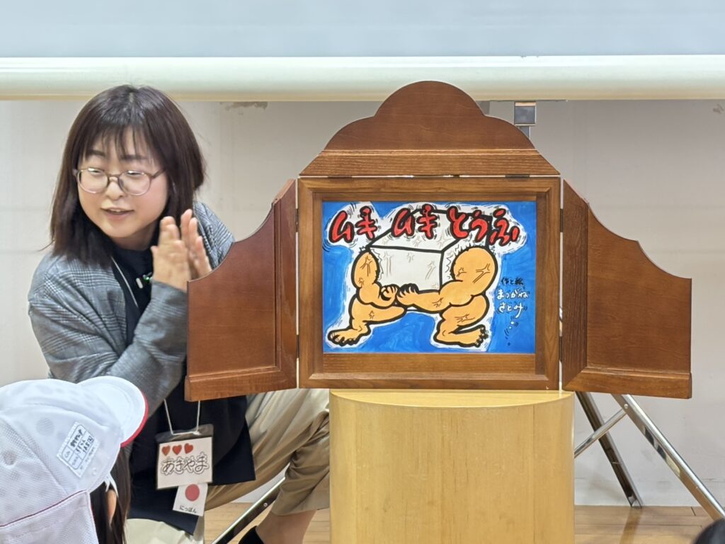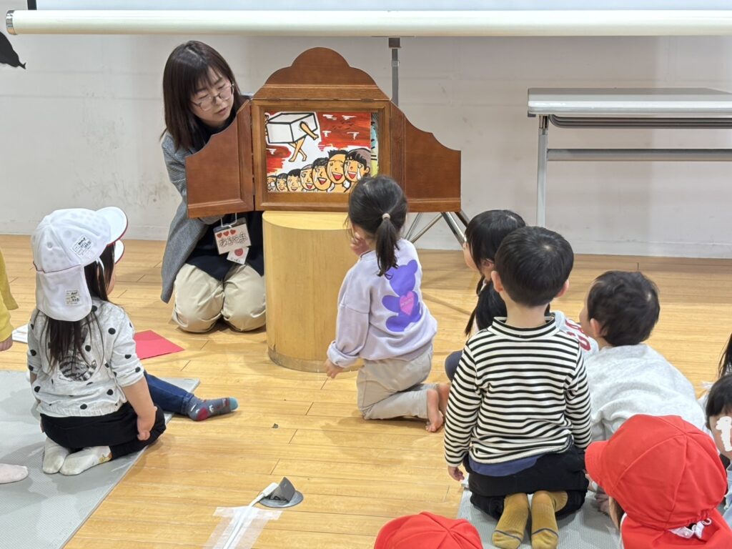 そして、秋山智美准教授(共創社会学部)が、昨年行われた手作り紙芝居の全国コンクールで“優秀賞・観客賞”をダブル受賞した自作の「ムキムキとうふ」を披露すると、子どもたちは身を乗り出すように観賞していました。
